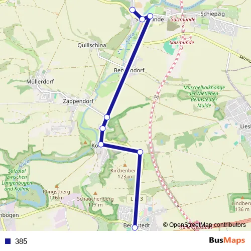 The first stop of the 385 bus route is Bennstedt (Salzatal), Ortsmitte and the last stop is Salzmünde, Carl-Wentzel-Platz. 385 is operational during по будням.