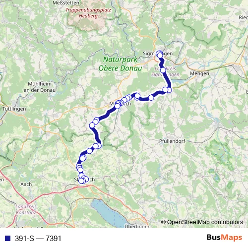 The first stop of the 391-S bus route is Meßkirch, Bahnhof and the last stop is Stockach, Busbahnhof. 391-S (7391) is operational during ежедневно.