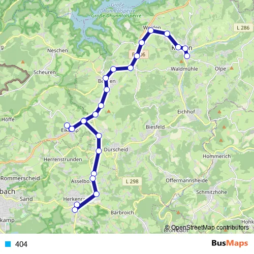 The first stop of the 404 tram route is Kürten Schulzentrum and the last stop is Bergisch Gladbach Herkenrath Ball. 404 is operational during ежедневно.