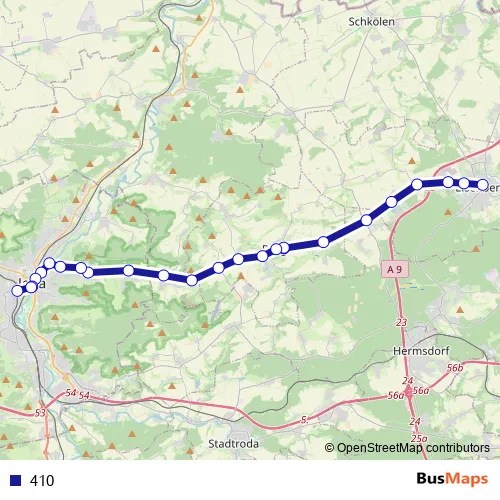 The first stop of the 410 bus route is Eisenberg, Busbahnhof and the last stop is Jena, Westbahnhof. 410 is operational during ежедневно.