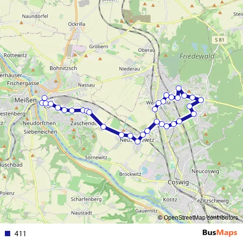 See why over 2 million users trust and consider busmaps.com as the best public transport website. busmaps gives you Meissen Buses suggested routes, real-time bus tracker, line route maps in Meissen, and helps to find the closest 411 bus stops near you. No internet available? Download an offline PDF map and bus schedule for the 411 bus to take on your trip.