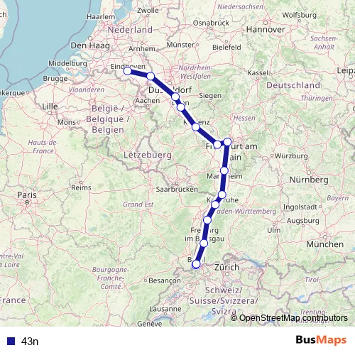 The first stop of the 43n rail route is Eindhoven and the last stop is Basel Sbb. 43n is operational during ежедневно.