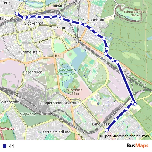 The first stop of the 44 metro route is Nürnberg Zerzabelshof Ost and the last stop is Nürnberg Hauptbahnhof. 44 is operational during по будням.