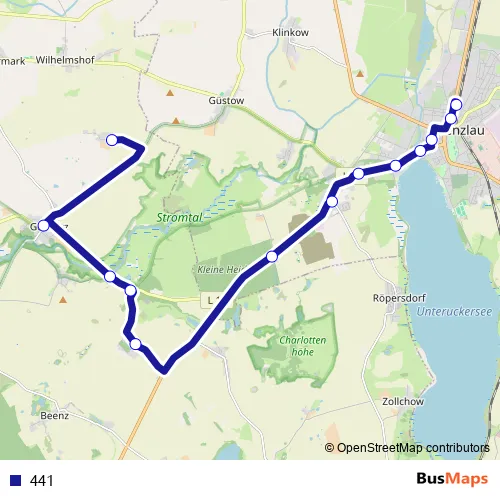 The first stop of the 441 bus route is Gollmitz (UM), Dorf and the last stop is Prenzlau, Zob. 441 is operational during по будням.