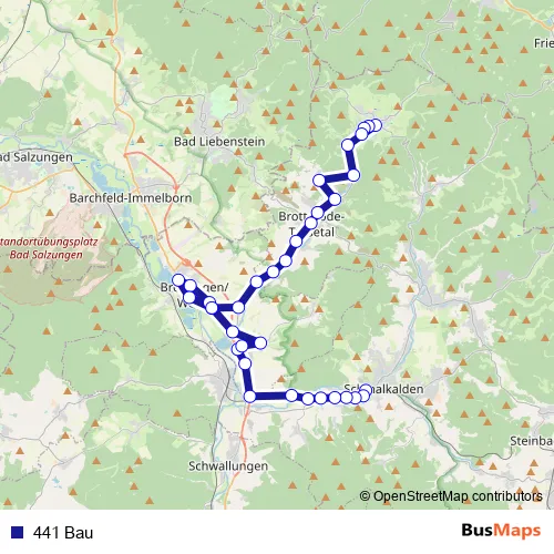The first stop of the 441 Bau bus route is Schmalkalden, Busbahnhof and the last stop is