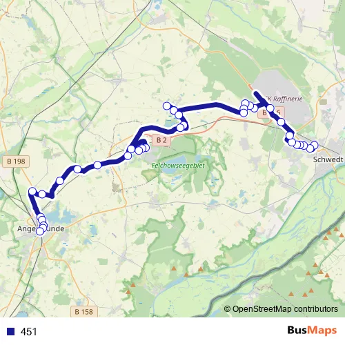The first stop of the 451 bus route is Schwedt, Zob and the last stop is Angermünde, Bahnhof. 451 is operational during по будням.