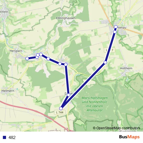 The first stop of the 482 bus route is Lichtenau, Stadtmitte and the last stop is