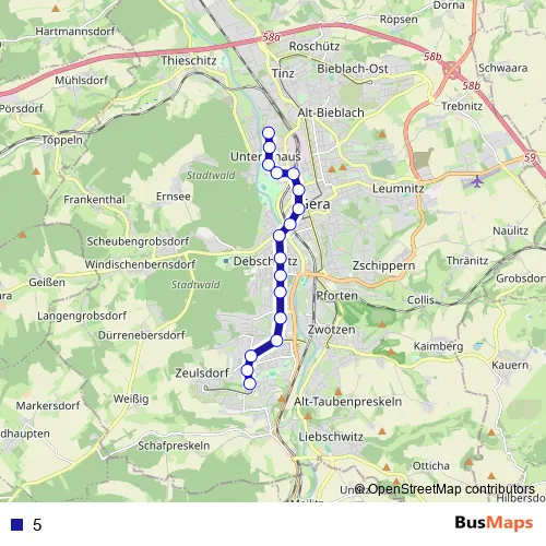 See why over 2 million users trust and consider busmaps.com as the best public transport website. busmaps gives you Gera Trams suggested routes, real-time bus tracker, line route maps in Gera, and helps to find the closest 5 tram stops near you. No internet available? Download an offline PDF map and bus schedule for the 5 tram to take on your trip.