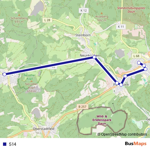 The first stop of the 514 bus route is Daun, Berliner Straße and the last stop is Neroth, Hauptstraße. 514 is operational during по будням.