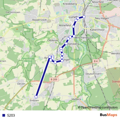 The first stop of the 5203 bus route is Embsen, Schulzentrum and the last stop is Bf. Lüneburg (Zob). 5203 is operational during ежедневно.