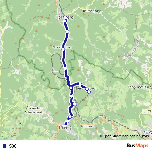 The first stop of the 530 bus route is Hornberg (Schwarzw) and the last stop is Triberg Marktplatz. 530 is operational during ежедневно.