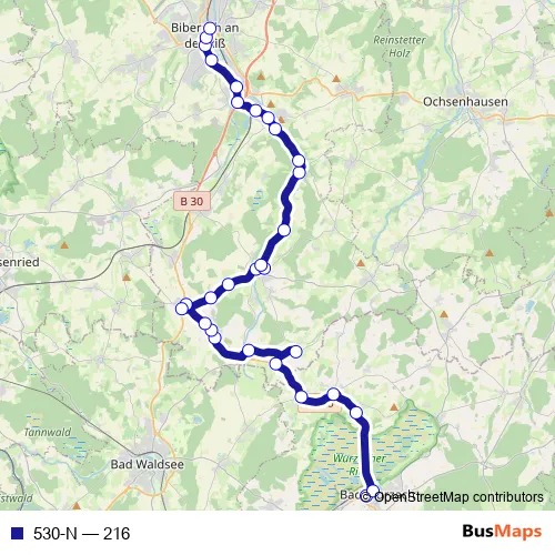 The first stop of the 530-N bus route is Bad Wurzach, Schulzentrum and the last stop is Biberach, ZOB/Bahnhof. 530-N (216) is operational during по будням.