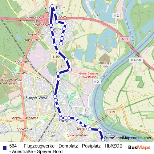 Bus 564 - Flugzeugwerke - Domplatz - Postplatz - Hbf/ZOB - Auestraße - Speyer Nord in Speyer: Stops & Timetable