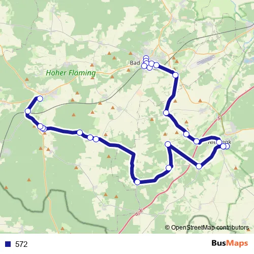 The first stop of the 572 bus route is Bad Belzig, Bahnhof and the last stop is