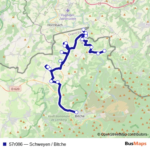 The first stop of the 57r086 bus route is Bitche - Etablissements Scolaires and the last stop is Volmunster - Eschviller. 57r086 (Schweyen / Bitche) is operational during по будням.