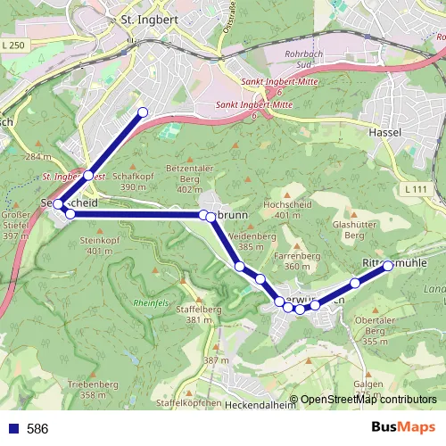 The first stop of the 586 bus route is Südschule, St.Ingbert and the last stop is Rittersmühle, Oberwürzbach St.Ingbert. 586 is operational during по будням.