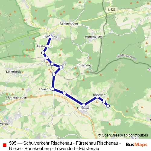 The first stop of the 595 bus route is Hx-Bödexen, Wendeplatz and the last stop is Lü-Rischenau, Post. 595 (Schulverkehr Rischenau - Fürstenau Rischenau - Niese - Bönekenberg - Löwendorf - Fürstenau) is operational during по будням.