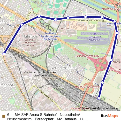 6 Tram - MA SAP Arena S-Bahnhof - Neuostheim/Neuhermsheim - Paradeplatz - MA Rathaus - LU Rathaus - Berliner Platz - LU Rheingönheim