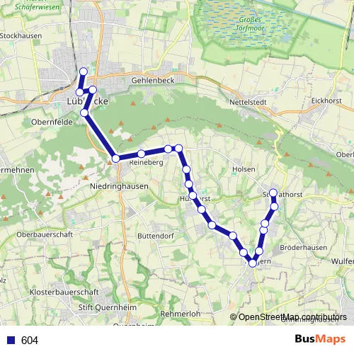 The first stop of the 604 bus route is Lübbecke, Zob and the last stop is Hü-Schnathorst, Schule. 604 is operational during ежедневно.