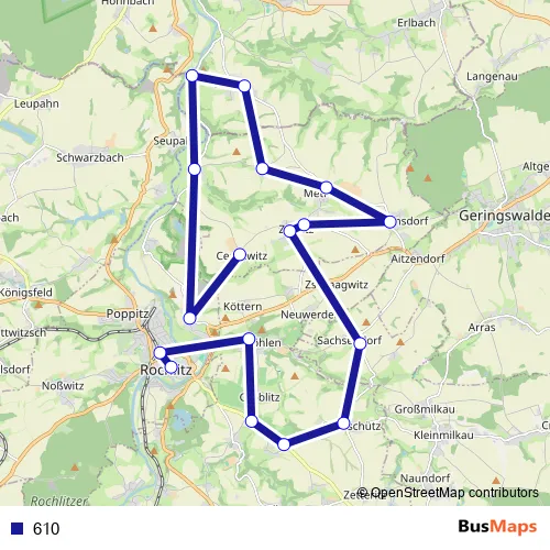 The first stop of the 610 bus route is Rochlitz (Sachsen), Rathausstr. and the last stop is Ceesewitz. 610 is operational during по будням.