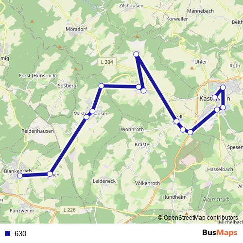 The first stop of the 630 bus route is Kastellaun Marktplatz and the last stop is Blankenrath Busbahnhof. 630 is operational during ежедневно.