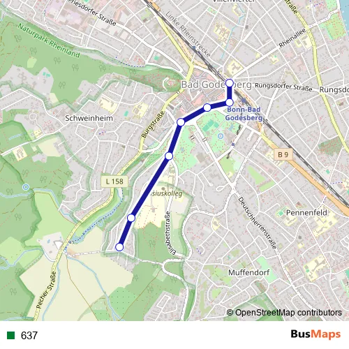 The first stop of the 637 rail route is Bonn Bad Godesberg Bf / Rheinallee and the last stop is Bonn Bad Godesberg Marienforster Steinweg. 637 is operational during ежедневно.