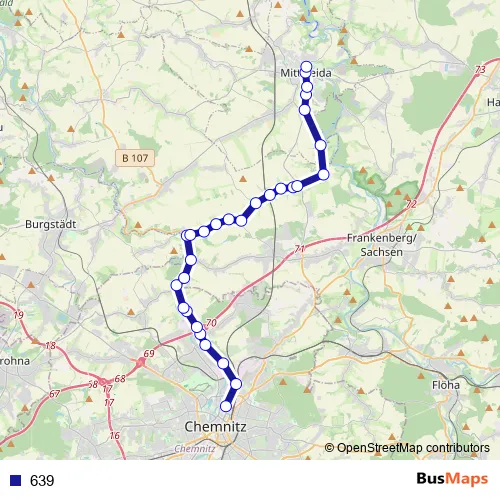The first stop of the 639 bus route is Chemnitz, Omnibusbahnhof and the last stop is Mittweida, Busbahnhof. 639 is operational during по будням.