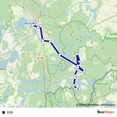 The first stop of the 639 bus route is Neustrelitz, ZOB (Ea) and the last stop is Dabelow, Oberdorf. 639 is operational during по будням.