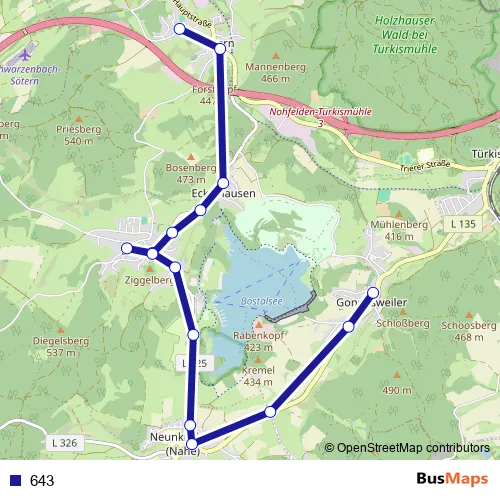 The first stop of the 643 bus route is Grundschule, Gonnesweiler Nohfelden and the last stop is