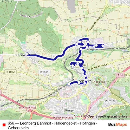 The first stop of the 656 bus route is Leonberg Bf and the last stop is