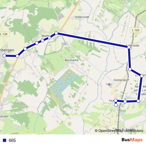 The first stop of the 685 bus route is Hambergen(b Bremen), KGS/GS H1 and the last stop is Hüttenbusch, Mitte, Mast 2. 685 is operational during по будням.