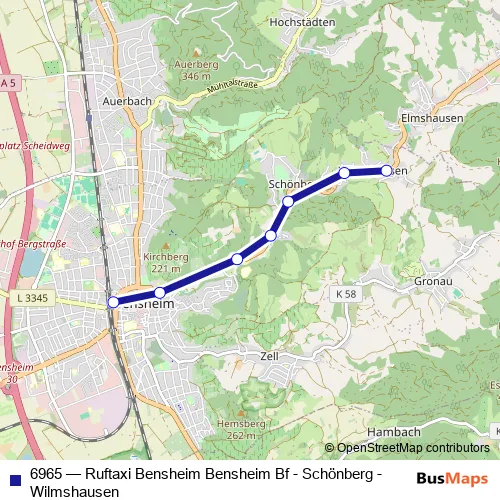 Click here to view the nearest 6965 - Ruftaxi Bensheim Bensheim Bf - Schönberg - Wilmshausen bus stop.