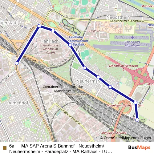 The first stop of the 6a tram route is MA Hochschule and the last stop is SAP Arena S-Bahnhof. 6a (MA SAP Arena S-Bahnhof - Neuostheim/Neuhermsheim - Paradeplatz - MA Rathaus - LU Rathaus - Berliner Platz - LU Rheingönheim) is operational during ежедневно.