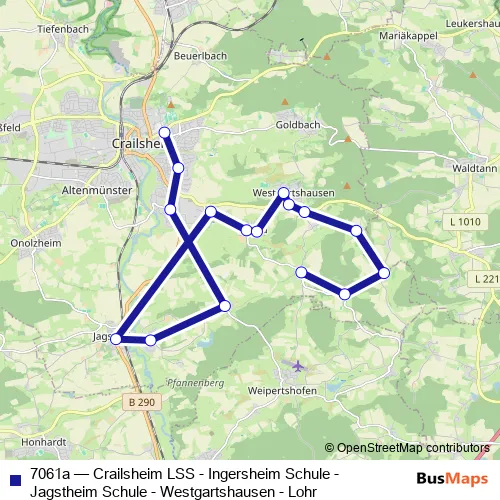The first stop of the 7061a bus route is Crailsheim Leonh.-S-Schule and the last stop is Lohr (b. Crailsh.) Ort. 7061a (Crailsheim LSS - Ingersheim Schule - Jagstheim Schule - Westgartshausen - Lohr) is operational during по будням.
