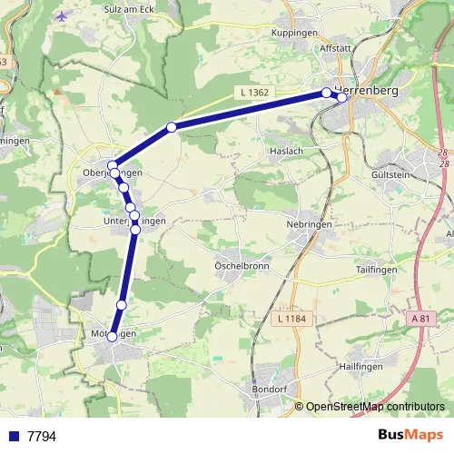 The first stop of the 7794 bus route is Herrenberg Kalkofenstr. and the last stop is Mötzingen Rathaus. 7794 is operational during по будням.
