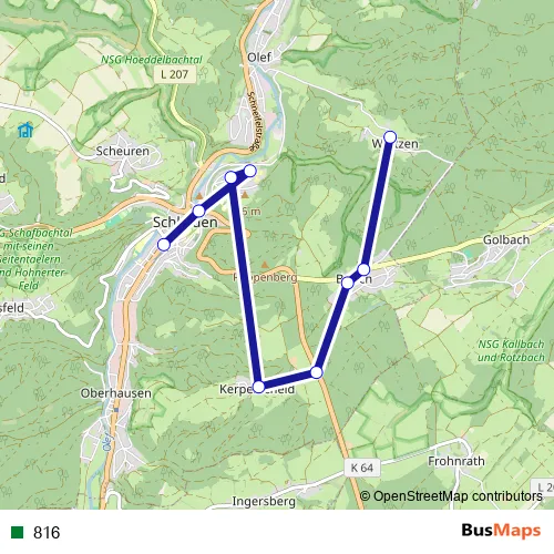 The first stop of the 816 rail route is Schleiden Wintzen and the last stop is Schleiden Busbf. 816 is operational during ежедневно.