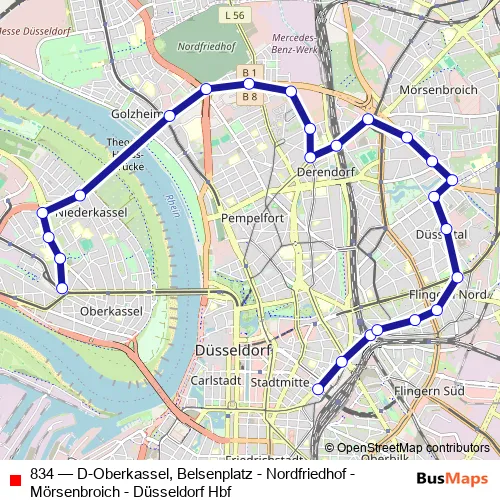 D-Theodor-Heuss-Brücke. 834 (D-Oberkassel, Belsenplatz - Nordfriedhof - Mörsenbroich - Düsseldorf Hbf) is operational during ежедневно.