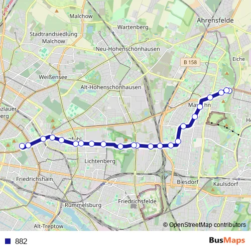 See why over 2 million users trust and consider busmaps.com as the best public transport website. busmaps gives you Berlin Trams suggested routes, real-time bus tracker, line route maps in Berlin, and helps to find the closest 882 tram stops near you. No internet available? Download an offline PDF map and bus schedule for the 882 tram to take on your trip.