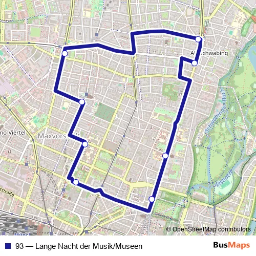 The first stop of the 93 bus route is Odeonsplatz and the last stop is Odeonsplatz. 93 (Lange Nacht der Musik/Museen) is operational during ежедневно.