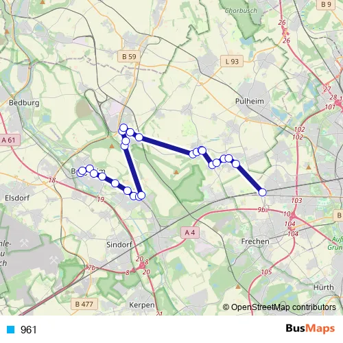 The first stop of the 961 tram route is Bergheim Kreishaus and the last stop is Köln Weiden West. 961 is operational during ежедневно.