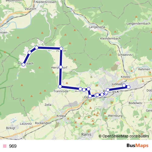 The first stop of the 969 bus route is Friedebach, Wendeschleife and the last stop is Pößneck, Rosa-Luxemburg-Straße. 969 is operational during по будням.