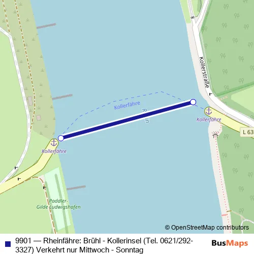 Services on the 9901 - Rheinfähre: Brühl - Kollerinsel (Tel. 0621/292-3327) Verkehrt nur Mittwoch - Sonntag ferry start at 10:30 on среда, четверг, пятница, суббота, воскресенье.