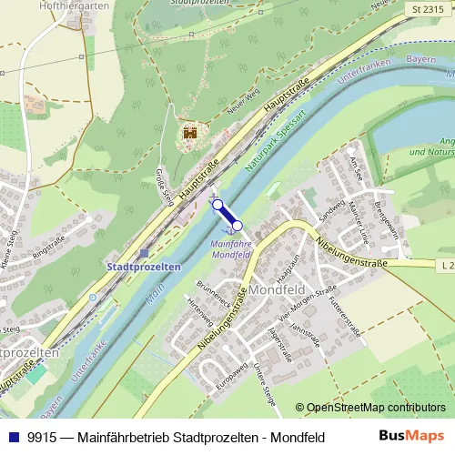 The first stop of the 9915 ferry route is Stadtprozelten, Fähre and the last stop is Stadtprozelten, Fähre. 9915 (Mainfährbetrieb Stadtprozelten - Mondfeld) is operational during ежедневно.
