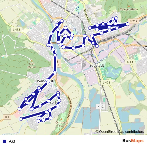 The first stop of the Ast bus route is Hameln Adalbert-Stifter-Weg and the last stop is Klein Berkel Multimarkt/Süd. Ast is operational during ежедневно.