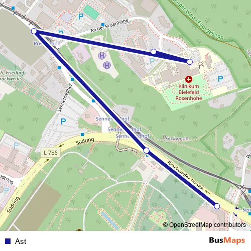 The first stop of the Ast bus route is BI-Brackwede, Rosenhöhe Altenheim and the last stop is