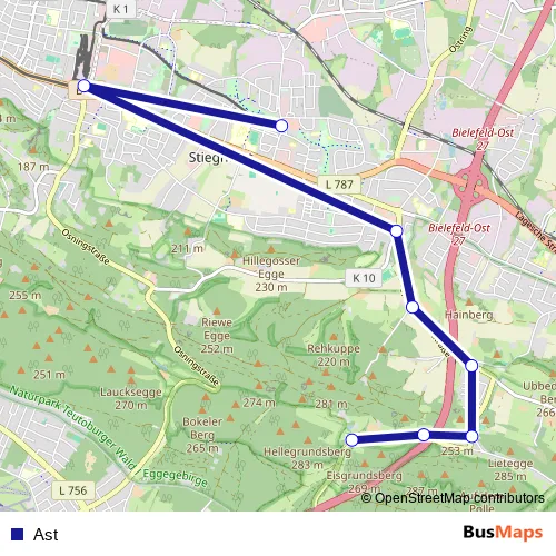 The first stop of the Ast bus route is Bielefeld, Stieghorst and the last stop is