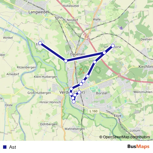 The first stop of the Ast bus route is Verden(Aller) Bahnhof/Zob and the last stop is Eißel Alte Schule. Ast is operational during ежедневно.