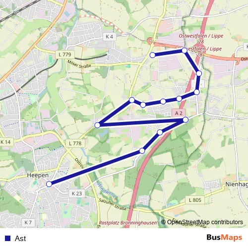 The first stop of the Ast bus route is Bi-Altenhagen, Vinner Straße and the last stop is