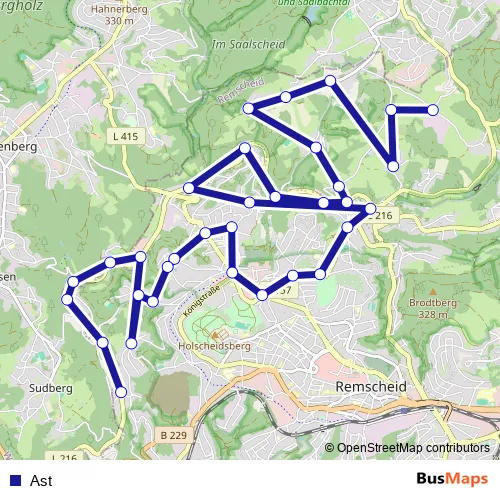 The first stop of the Ast bus route is Remscheid Flügel and the last stop is