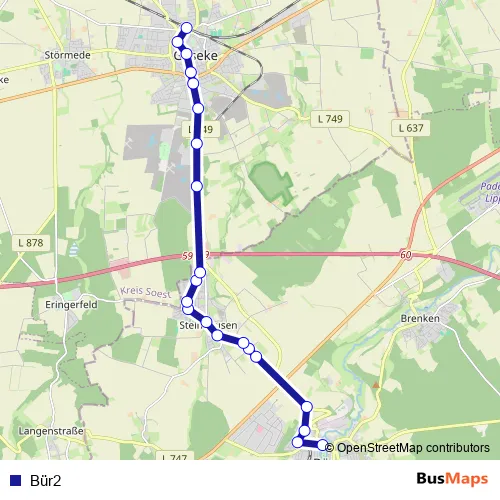 The first stop of the Bür2 bus route is Büren, Alte Post and the last stop is Geseke, Bahnhof. Bür2 is operational during ежедневно.